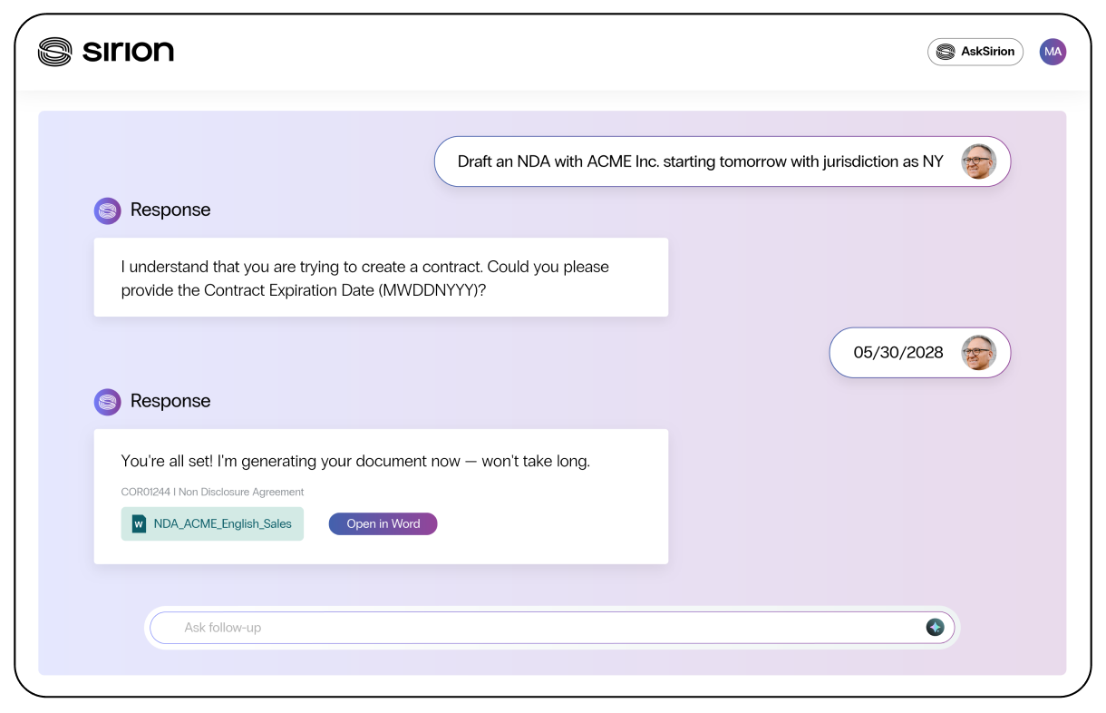Generate complete contracts from simple requests. Tell AskSirion what you need – an NDA, service agreement, or complex MSA – and receive a fully drafted document based on your templates and business requirements.