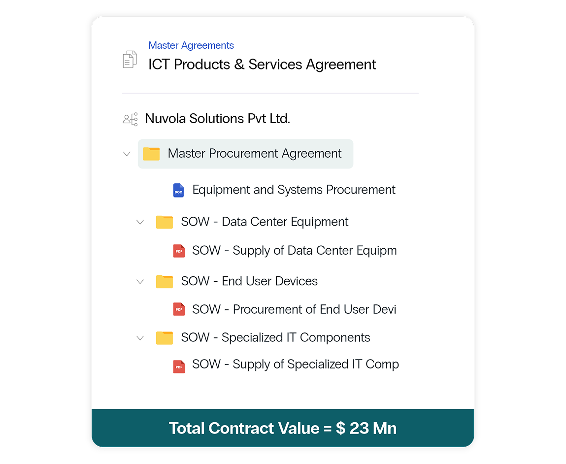Access all contracts, SLAs, and obligations in a unified, hierarchical repository. Sirion connects every document to its supplier, customer, or project — giving you full context, not scattered search results.