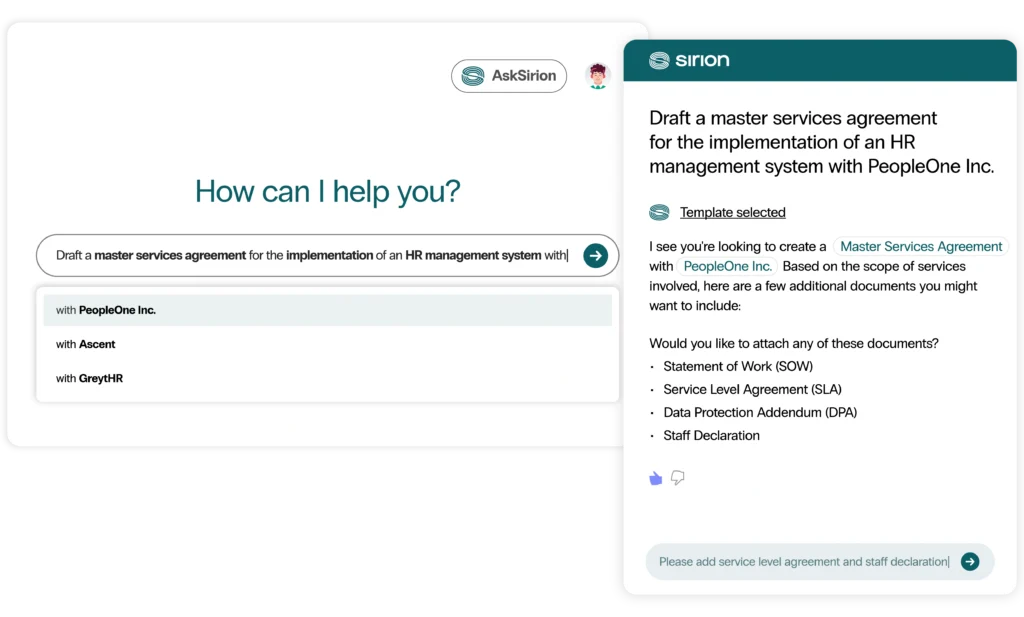Draft contracts through simple conversation with AskSirion, leveraging past insights and approved language.